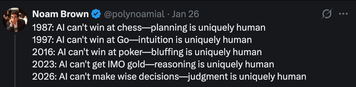 As of February 2026, AIs are currently better than the best humans at a narrow range of tasks (Chess, Go, Starcraft, weather forecasting). They are on par with or almost on par with skilled professionals at many others (coding, answering PhD-level general knowledge questions, competition-level math, urban driving, some commercial art, writing1), and slightly worse than people at most tasks2.